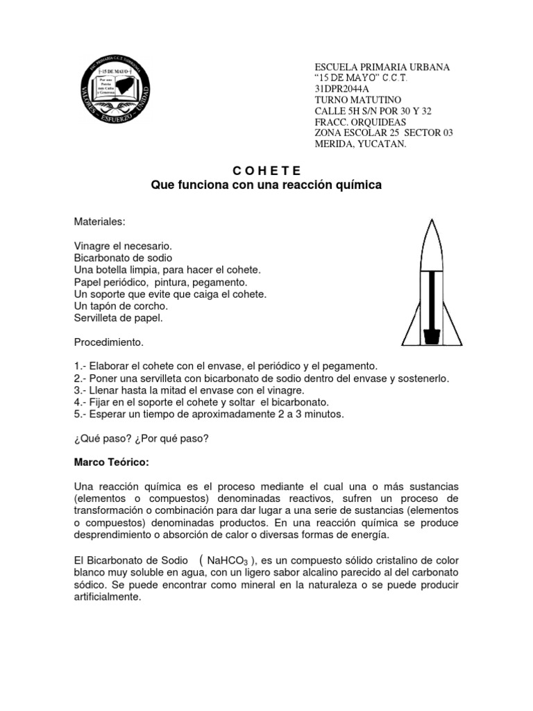 Experimento Del Cohete Quimico from www.experimentoscientificos.es También se puede utilizar este método para hacer cohetes caseros de cartón o plástico, y podrás hacerlos volar a lo largo de largas distancias, si los ingredientes son los. Las expertas señalan que el bicarbonato de sodio también se puede emplear: Más beneficios del bicarbonato de sodio para la salud. Introducimos en la botella 100 mililitros de vinagre, colocamos la pequeña bolsa dentro de la botella (sin que tocara el vinagre) atándole con una parte del hilo hacia fuera. Volcán casero alternativas al bicarbonato de sodio y vinagre a menudo son otros ingredientes que se pueden encontrar alrededor de la casa o en lo en vez de usar vinagre, utilizar salsa de tomate con bicarbonato de sodio. El bicarbonato de sodio es un compuesto de color blanco soluble en agua parecido al carbonato de sodio pero menos fuerte que ligado con compuestos ácidos puede llegar a tener muchos resultados en cuanto a la limpieza de la casa cuidados de los dientes, eliminar olores, cuidado del cabello o para el. También tiene muchos usos en el cuidado personal. Juntamos un poco de bicarbonato y de vinagre blanco y pasamos la mezcla sobre esta zona y luego retiramos con un.